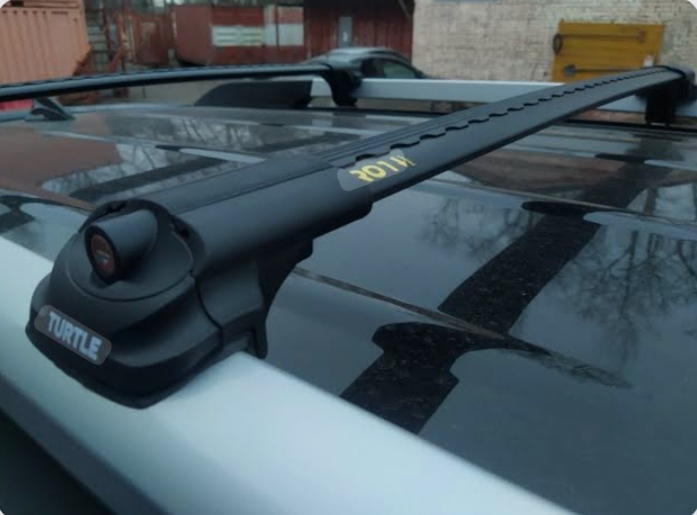 Багажник состоит из двух поперечин аэродинамического, овального сечения. Профиль поперечин 70х24мм., изготовлен из анодированного алюминия. Для придания жесткости профиля во внутренней части по всей длине выполнено квадратное усиление. На верхней поверхности поперечин изготовлен технологический паз закрытый резиновым уплотнителем фигурной формы. Резиновая вставка препятствует скольжению груза и придает привлекательный внешний вид. По краям поперечин выполнены отверстия для фиксации опор на поперечине